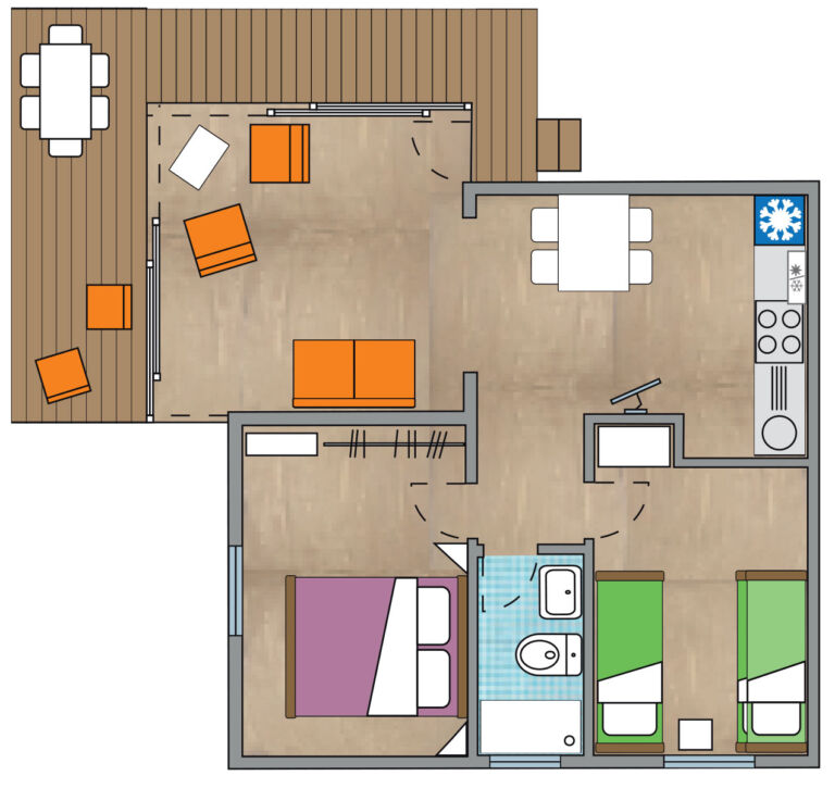 52 sqm accommodation with an integrated 20 sqm terrace, ideal for family stays.