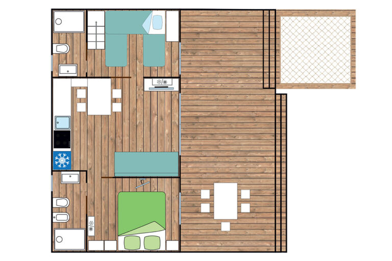 The characteristic 37 sqm covered terrace, furnished with a table and chairs, extends across the entire width of the mobile home and continues outdoors with an 8 sqm elevated peninsula, enhanced by a high-resistance suspended net.