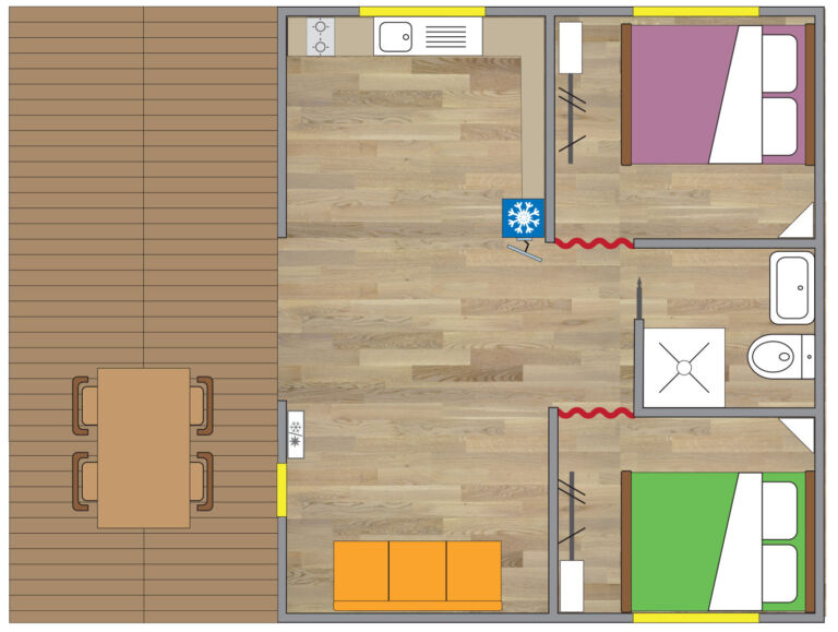 La Glamping Laguna Top Lodge si sviluppa su 37 mq, comprensivi di terrazza coperta arredata con tavolo, sedie e cancelletto, ed è una soluzione sospesa su pilastri in legno con affaccio diretto sulla piscina.