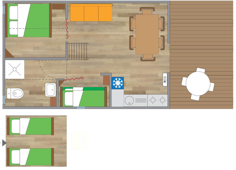 La struttura si sviluppa su 34 mq e può ospitare fino a sei persone